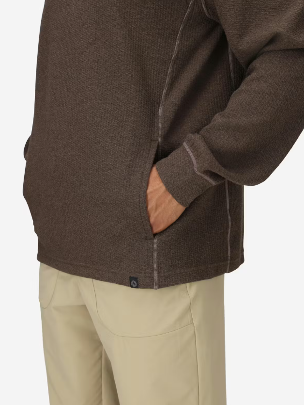Marmot Ridge Tech Hoody е универсална дреха, съчетаваща комфорт и практичност. Материята е с структуриран външен слой и мека вътрешна повърхност, което осигурява приятно усещане при носене и допълнителна издръжливост. Комбинацията от памук, рециклиран полиестер и еластан осигурява добра еластичност, свобода на движение и дишаемост през целия ден.